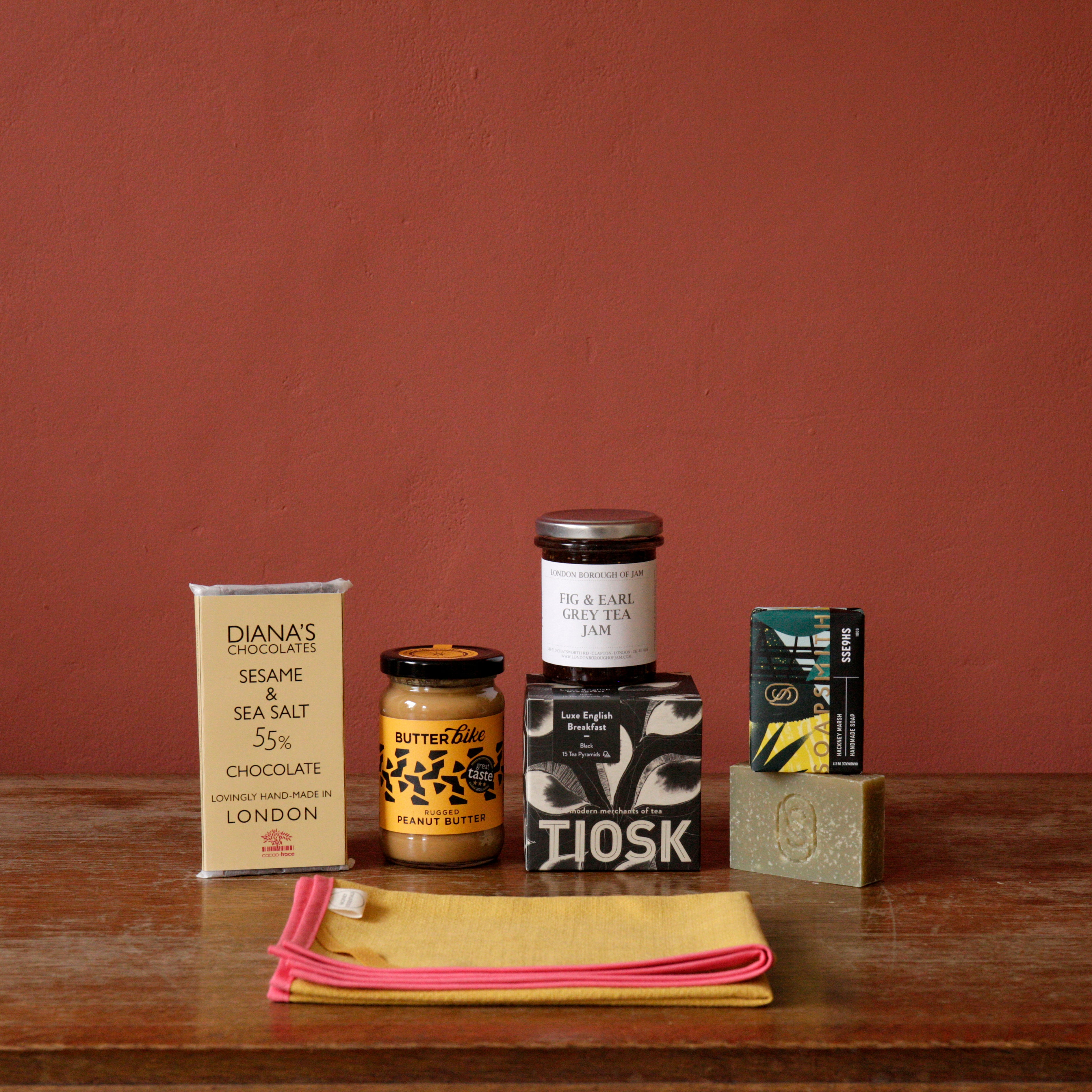 Celebrate the best of our shop favourites with this thoughtfully curated collection. From soothing Tiosk Tea to treats like Butter Bike Peanut Butter and a jar of London Borough of Jam, each item is a locally produced customer favourite. With Soapsmith’s Hackney Marsh soap, indulgent Diana’s Chocolate, and our signature Hackney Essentials Tea Towel, this hamper is a true celebration of local favourites.