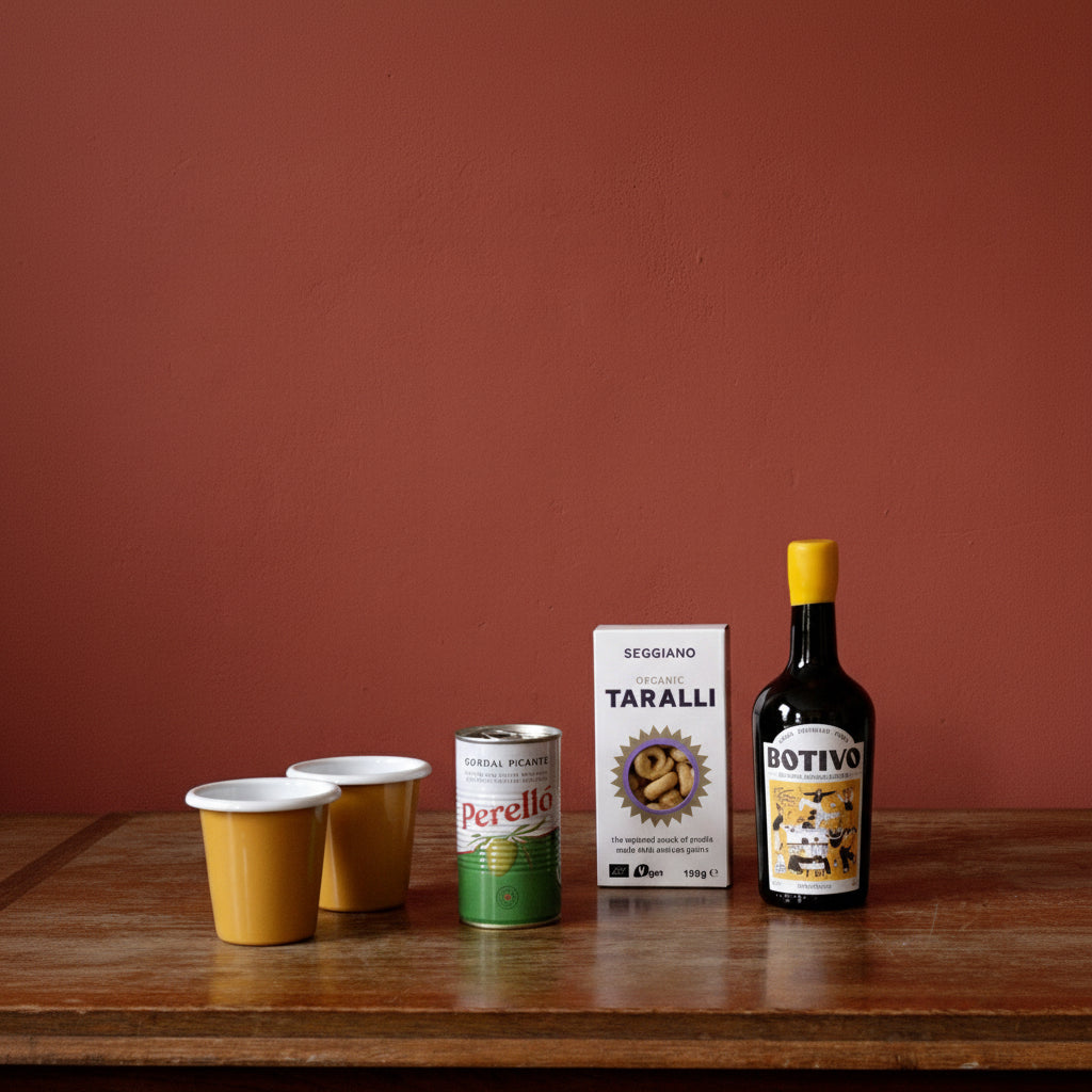 Enjoy the ritual of aperitivo, minus the alcohol. This selection features customer favourite Botivo, perfectly paired with Seggiano Taralli and Perelló olives for an authentic Italian touch. Two Falcon Tumblers complete the set, ideal for relaxed evenings or mindful celebrations.